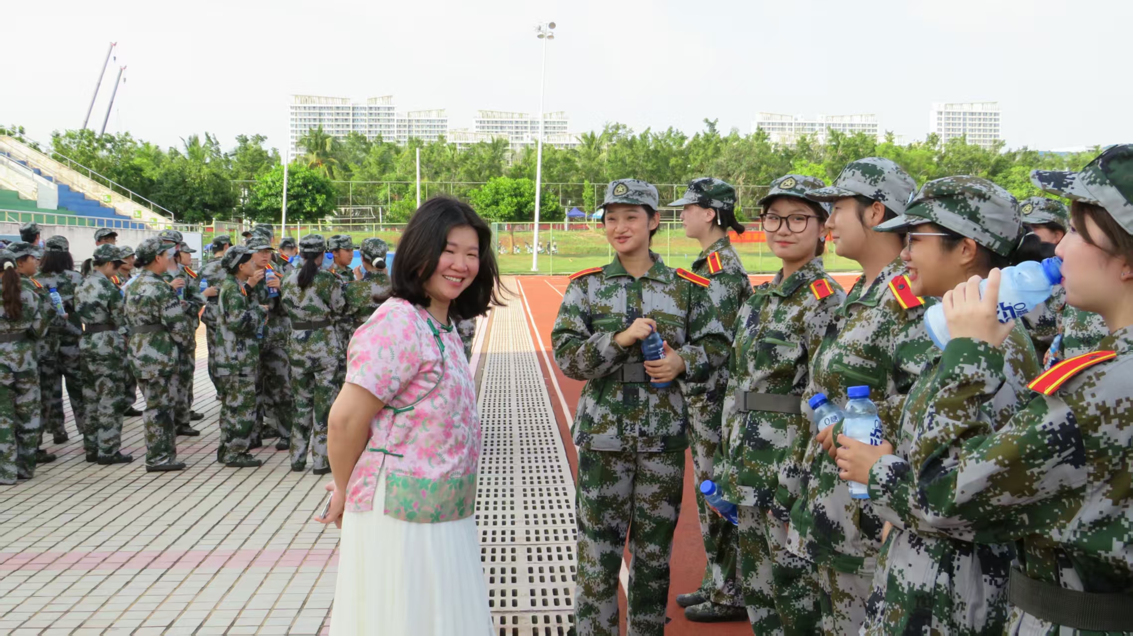 军训砺意志,关怀暖人心。2025年9月21日15时30分,海南师范大学外国语乐鱼网页版党委杨白全副书记与2025级辅导员朱大珩老师,前往风雨操场,看望并慰问正在军训的2025级承训教官及新生。
